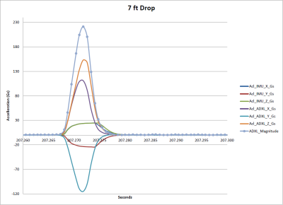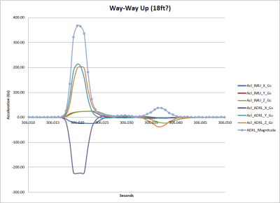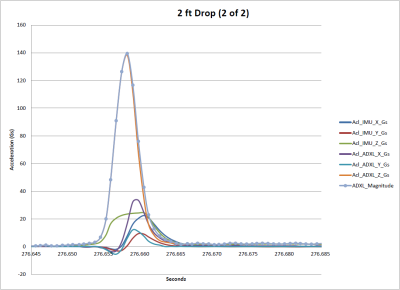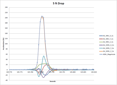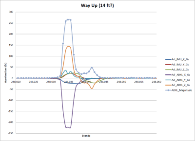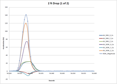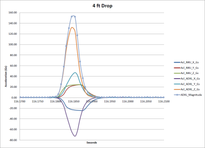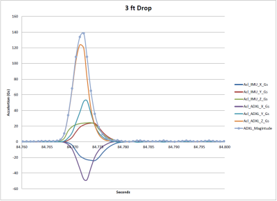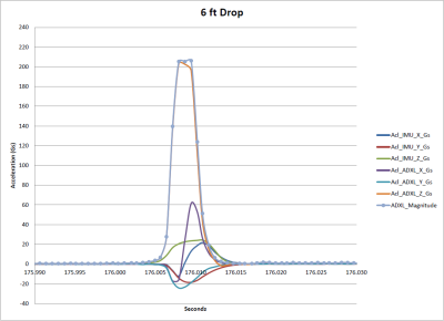 For the last few years there has been continuing discussions regarding the increased number of student payloads that seemed to have been damaged while being deployed from ARLISS rockets. (ARLISS is an annual international launch event sponsored by AEROPAC. For more information see www.ARLISS.org.) Following the 2012 ARLISS event, a team was assembled to create the ARLISS Data Logger, a device that could be used to instrument the current fleet of AEROPAC ARLISS rockets and measure the forces that the rockets were inflicting upon their payloads. The ARLISS Data Logger is an electronics module that resides in the bottom bulkhead of the ARLISS payload carrier. Both the carrier internal payload compartment space and the carrier external dimensions were maintained so that these instrumented carriers were compatible with existing payloads and rockets. This made it possible to deploy the instrumented carriers widely across the fleet and collect sufficient data to begin to profile AEROPAC’s ARLISS fleet. For a more in depth description of the ARLISS Data Logger Project click here. The Loggers were first used at the 2013 ARLISS event. The data from this the 2014 and 2015 events can be viewed here. The ARLISS Data Loggers used for this event had a maximum accurate measurement range of +/-50Gs. The sensors saturated just beyond that range. The Loggers used for the tests described on this web page have been modified to measure +/-200Gs. The Logger firmware was also modified to have the option to start recording after a fixed delay, rather than to trigger by the detection of a launch event. Carrier Drop TestsThe high acceleration forces measured by the logger during the ARLISS 2013 event surprised us. It also made us wonder whether payload carrier acceleration was a good standalone indicator of stress exerted upon a payload. To explore this, I conducted a series of "carrier drop tests" to provide a reference for the measured accelerations. The measurement data and a video of the drop tests are below. Click on the graph's image for a high resolution chart. The link to the Excel spreadsheet is below each image.