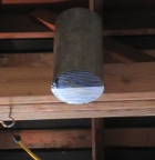 The keeping the wire length the same, we replaced the Calibration Mass with the rocket. The rocket was prepared as if for launch, except that the motor nozzle and propellant grains were omitted. The nozzle was replaced with the Nozzle Disc, so the rocket could be hung in the pendulum. The propellant was omitted, because we wanted to determine the rocket's moment of inertia during the coast phase of the flight (after the propellant is consumed).